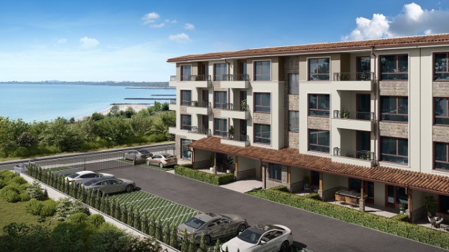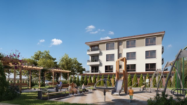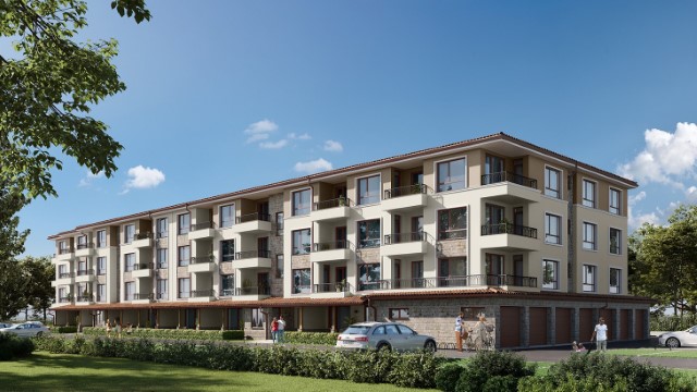 Description: The Bayview Family 2 complex will be a four-storey residential building, divided into two sections, with two separate entrances. Its vision will be identical to the other complexes in the area - low construction /4 floors/, large distances between buildings, stylish Mediterranean architecture, soft pastel tones, partial stone cladding of the facade, wrought iron railings, rich and well-maintained landscaping of the external areas and impeccable maintenance of the adjacent infrastructure. Approximately 5,000 sq.m of total built-up area will be distributed in 64 apartments. Ground floor apartments will have a covered veranda and yard. Its infrastructure will include a bicycle parking, a sports playground, a children's playground and a recreation area with gazebos. Parking in the complex will be provided by 66 open parking lots and 7 garages, and can be purchased for an additional fee. Two shops are also planned. The territory of the complex will be beautifully landscaped and well maintained. In the construction process, high quality materials will be used, as well as modern technologies, ensuring flawless execution and trouble-free operation of the building. The apartments are issued roughly finished. There is a possibility for full completion at an additional cost.