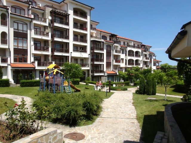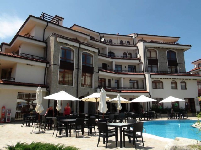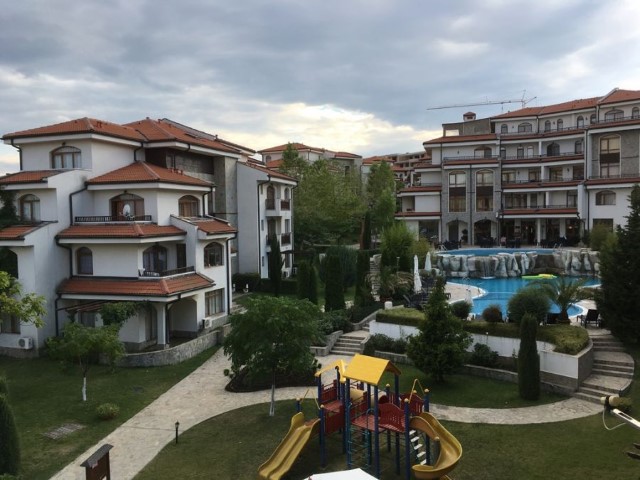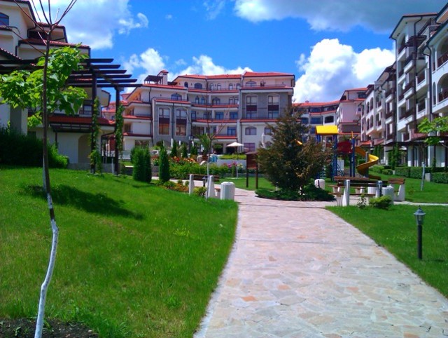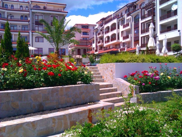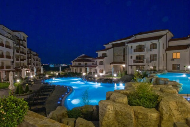 All the complexes at "Vinyards Spa Resort" are finished in a beautiful architectural style with references to Bulgarian traditional architecture - red roof tiles, wooden paneling, stone cladding. On the territory of the year-round functioning complex perfectly combine 5 residential buildings with 222 holiday apartments, 34 villas, 4-star hotel with lush greenery. The complex is secluded and protected by video surveillance and security. It offers many facilities for sports, recreation and entertainment, various establishments and water areas, its own meadow, vineyards, a winery and its own wine production, as well as a wide variety of amenities and modern services: //// gated area with limited access; two outdoor swimming pools for adults and children with sun beds and umbrellas; pool bar; indoor swimming pool; 24-hour reception; concierge; lobby bar; piano bar; elevator; free Wi-Fi throughout the complex; childrens playground and kindergarten; games room - table tennis, fitness, billiards and etc; park landscaping; alleys with places for recreation; a poolside restaurant serving Bulgarian and Mediterranean cuisine; an English pub offering sandwiches, pizza, barbecue; SPA and wellness center with massages and procedures for relaxation, mud treatment, healing procedures with lye, kinesitherapy procedures, several saunas, hot hub, steam bath, Russian bath, ice room, fitness, solarium, jacuzzi; shop and supermarket; beauty salon; postal services; BBQ area; open and closed sports center with riding school, billiards, table tennis; conference and business hall, Internet hall; year-round security and maintenance; guarded parking.