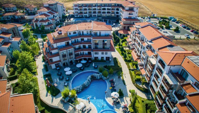 Description: Vinyards SPA Resort is a community of four exquisite gated complexes of apartments and detached villas, beautifully situated amidst rich green pastures with beautiful panoramic sea views and a communicative location 3 km away from the town of Aheloy and its beach, 4 km away from the town of Kableshkovo, 8 km away from Sunny Beach Resort, 10 km away from the old town of Nesebar, 20 km away from Burgas city and 10 km away from the town of Pomorie. Vinyards is located in a cozy, quiet, beautiful place, far from the bustling urban environment, situated on a gentle hill in the valley of the Aheloy river and Pomorie, with incredible panoramic sea views.