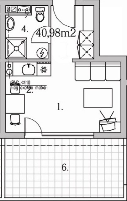 We offer for sale a fully finished studio with a total built-up area of 47,78 sq.m and a built-up area of 40,98 sq.m, situated on the sixth floor of a seven-storey residential building.