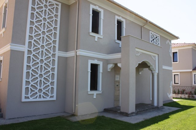 The houses are in a finished state. They are equipped with everything necessary for your luxurious accommodation. The infrastructure includes already constructed asphalt road to the complex, street network, sidewalks, grounds, street and park lightning, power substation, water-conduit and effluent treatment plant. The electrical wiring and plumbing are done according to European quality standards. The buildings are with monolithic construction, WIENERBERGER bricks, with perfect hydro, thermal and sound insulation, armoured doors and laminated HDF interior doors, six-chamber PVC system with window glazing. The roof system is BRAMAC. The access to the complex is under control which provides peace and security.
