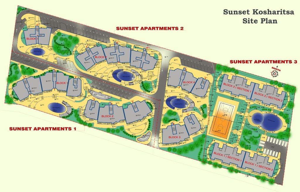 The stylish complex come with the following range of amenities: closed area with controlled access, 24-hour security, five swimming pools with children's areas, two pool bars, sun beds and umbrellas, a tennis court that can also be used as a volleyball/basketball court, mini market, shop, two fashionable restaurants (indoor and outdoor), open in summer and a cafe, children's playground, reception, elegant common areas and lighted landscaped gardens with alleys, sports center with halls for fitness and aerobics, SPA center with jacuzzi, sauna and steam bath, two solariums and two massage rooms, conference hall for 120 people with audio and video equipment, outdoor parking and year-round maintenance.