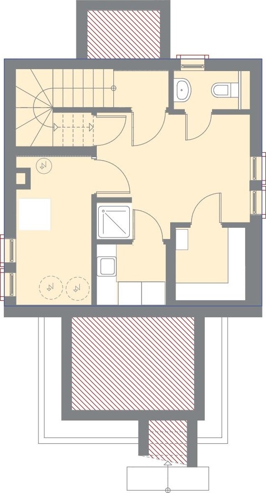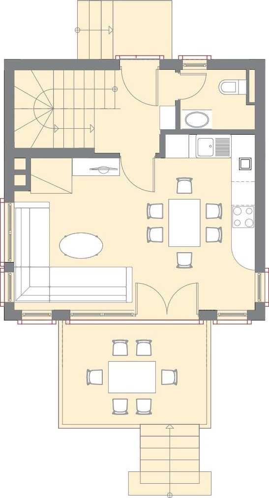 First floor (43,82 sq.m) - porch, entrance hall, living room with kitchen and dining area, closed veranda for breakfast in the open air and comfortable pastime with an access to the territory of the complex, shower room with toilet;