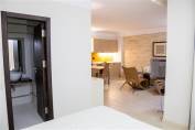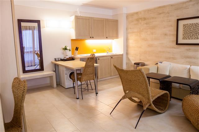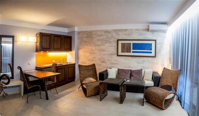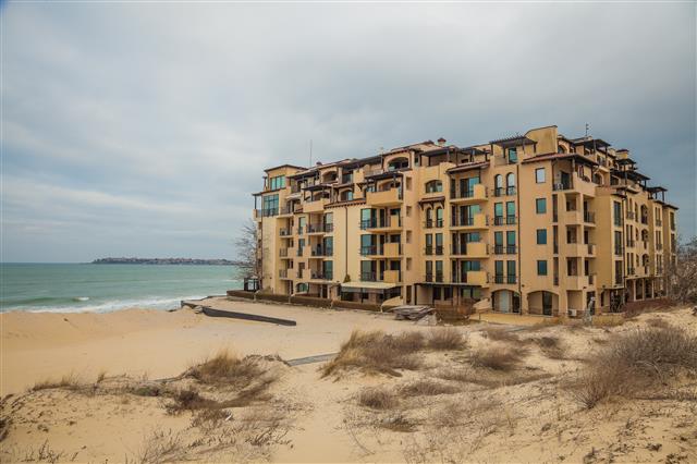 We offer for sale 2 identical one-bedroom apartments - both with total area 55,35 sq.m and. The apartments are situated on the 2nd and 3rd floors and each consists of living room with kitchenette and dining area, bedroom, bathroom with toilet and terrace. The apartments are for sale fully furnished. Kitchenette with electric hobs and oven and refrigerator. Dining area with table and chairs. Living room with sofa, rocking chairs, coffee table, wardrobe, TV with DVD player and stand, air conditioning. Bedroom - double bed with mattress, dresser with chair and mirror. Bathroom with bath and toilet, fully equipped. The apartments are equipped with air conditioning, cable TV, DVD-system, internet access in the rooms and on the beach, telephones in bathrooms, room service, individual terraces overlooking the sea, kitchen, sound system in the bathroom, safety deposit boxes at reception.
