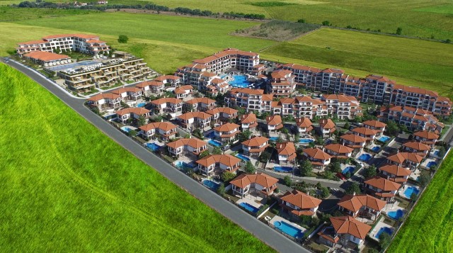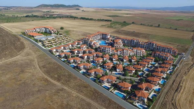 Description: Vinyards SPA Resort is a community of four exquisite gated complexes of apartments and detached villas, beautifully situated amidst rich green pastures with beautiful panoramic sea views and a communicative location 3 km away from the town of Aheloy and its beach, 4 km away from the town of Kableshkovo, 8 km away from Sunny Beach Resort, 10 km away from the old town of Nesebar, 20 km away from Burgas city and 10 km away from the town of Pomorie. Vinyards is located in a cozy, quiet, beautiful place, far from the bustling urban environment, situated on a gentle hill in the valley of the Aheloy river and Pomorie, with incredible panoramic sea views.