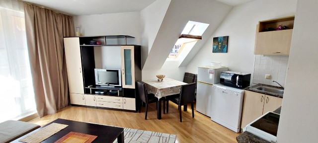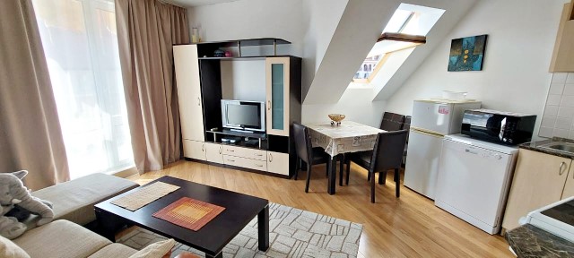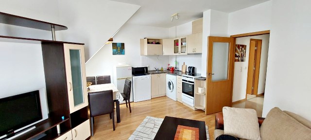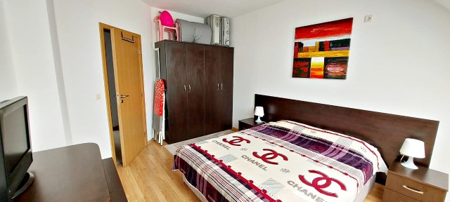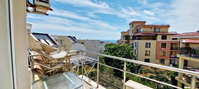 For sale a fully furnished, one-bedroom apartment with sea view in a gated complex, about 350 meters away from the beach in the town of Sveti Vlas, Nesebar municipality