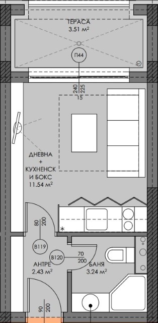 Finishing works: The studio is quality and fully finished, as follows: laminated and terracotta tiled floors; walls and ceilings - latex painted; installed MDF doors; installed PVC joinery; shower room with toilet - fully finished and equipped, terracotta tiled floor, faience on the walls, sanitary ware, shower cabin, water heater; installed Air conditioning.