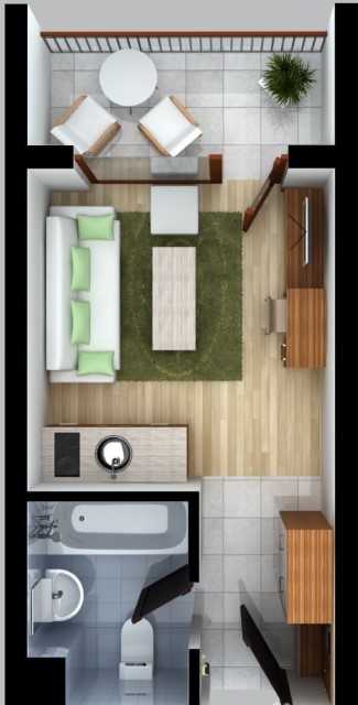 Distribution: entrance hall, living room with kitchen, dining area and slepping area, shower room with toilet and terrace.