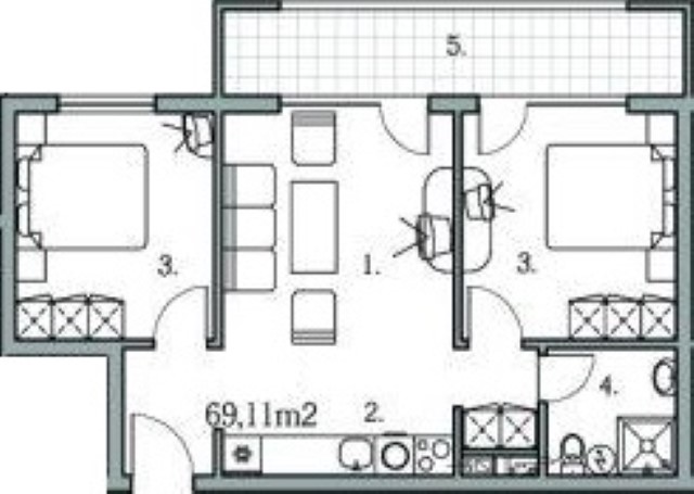 Description: We offer for sale a fully furnished two-bedroom apartment with a total built-up area of 78,78 sq.m and a built-up area of 69,11 sq.m, which is situated on the first residential floor in three-storey residential building, overlooking a hills and neighboring buildings in the complex. The apartment is suitable for your holiday and year-round use. Possibility of excellent and very good investment.