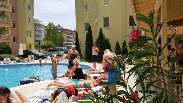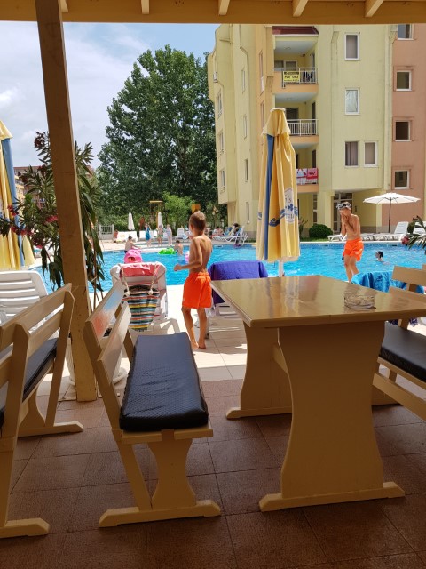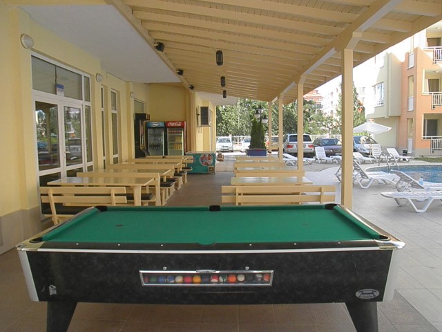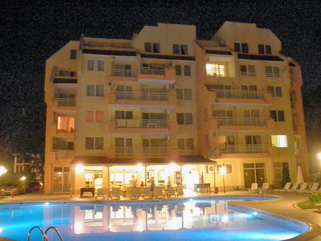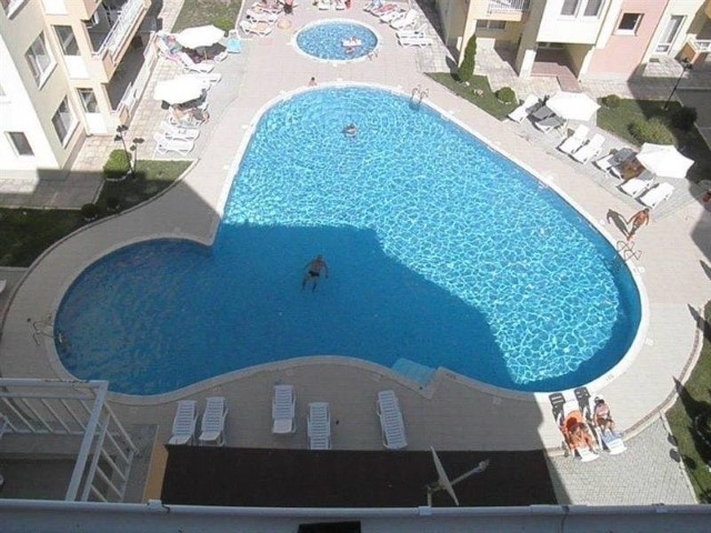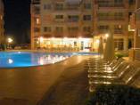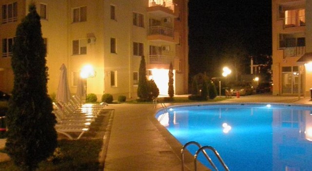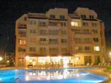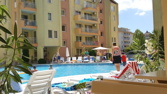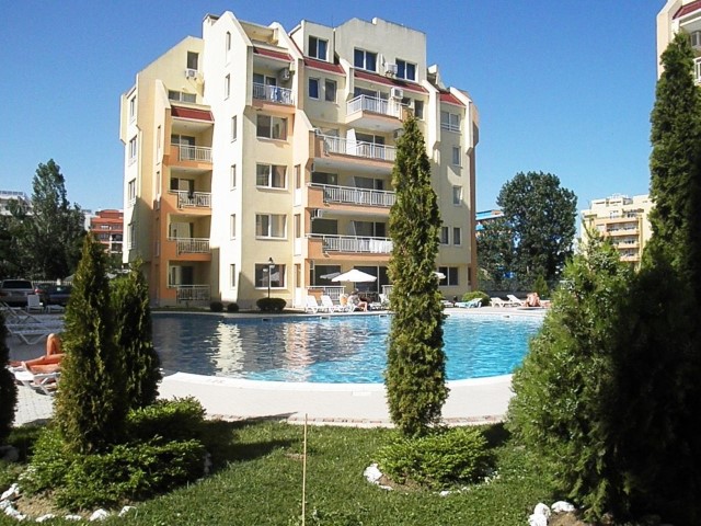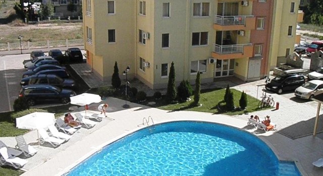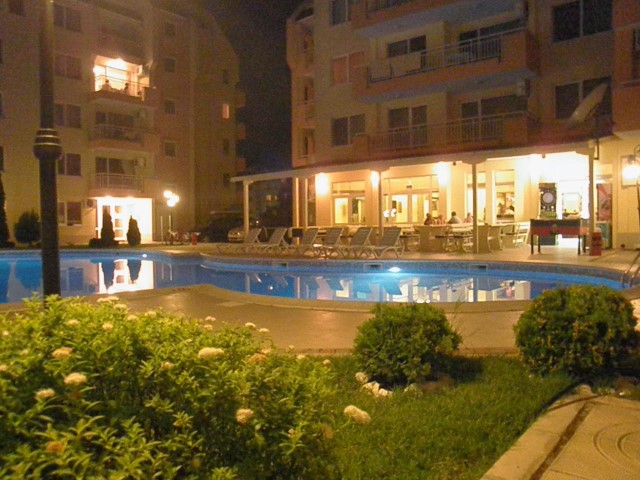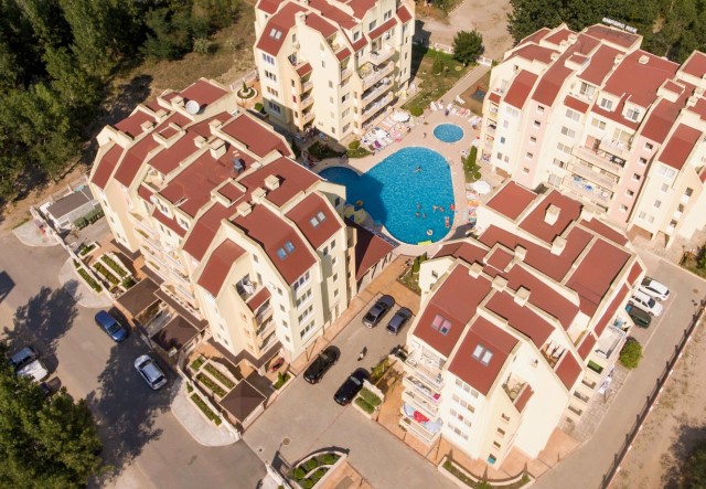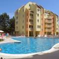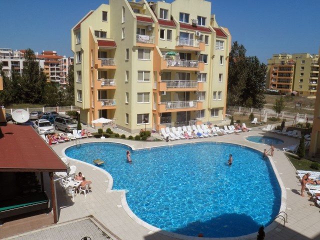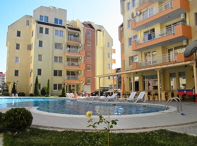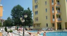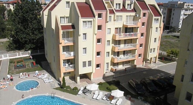 Description: The complex is located in a quiet area in the central part of Sunny Beach Resort, about 500 meters away from the beach, in an area with good infrastructure, close to communications and convenient bus transport. There is a large year-round supermarket within walking distance. The complex is situated on an area of 5400 sq.m and consists of four buildings and offers 140 apartments with an area from 50 to 100 sq.m. Infrastructure, amenities and services in the complex: swimming pool with separate children's area, elevators, parking, cafe-restaurant, shops, 24-hour security and maintenance, private access, reception and chambermaid office, green areas, children's playground.