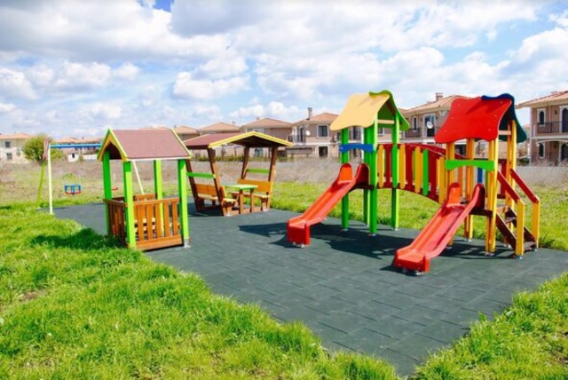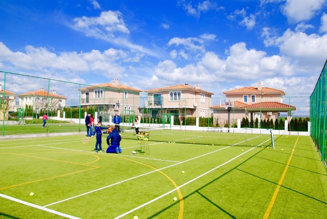 beautiful park with alleys for walks and green areas, tennis court, football field, basketball court, limited access, security system, year-round service. From each house has a sea view.