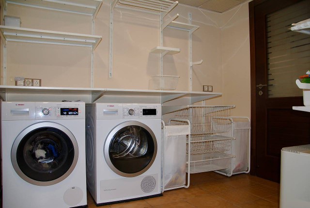 Basement (area of 120 sq.m) - utility room (equipped with washing machine and dryer BOSCH), boiler room with 500 liters water heater, food storage room (equipped with shelves), SPA center with Jacuzzi, area for sauna (not equipped), gym (equipped with a treadmill; billiards can be placed) and shower room with toilet and dressing room (equipped with hydromassage shower);