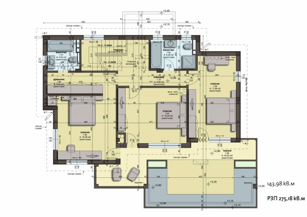 Second floor (143,98 sq.m) - corridor, three bedrooms, one of bedrooms with ensuite shower room with toilet, second bathroom with toilet, wide terrace with a shallow pool and with an access from all bedrooms;