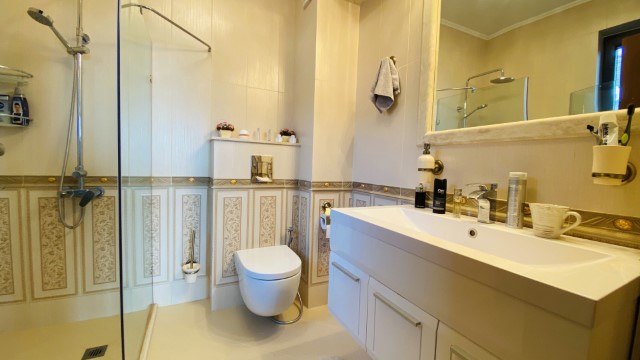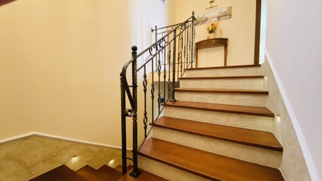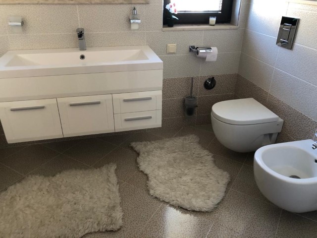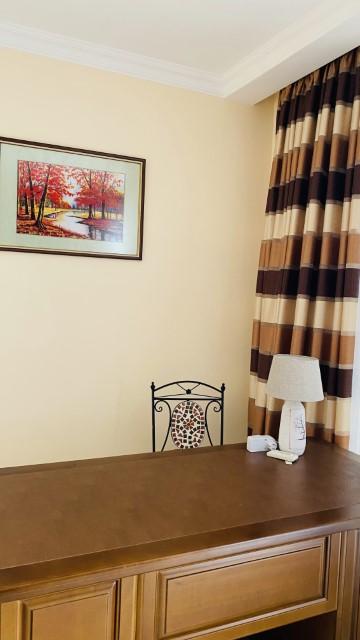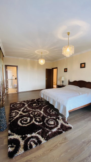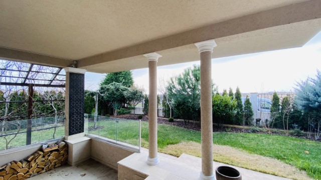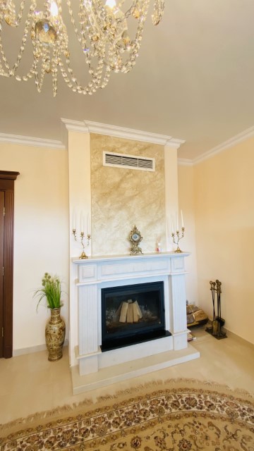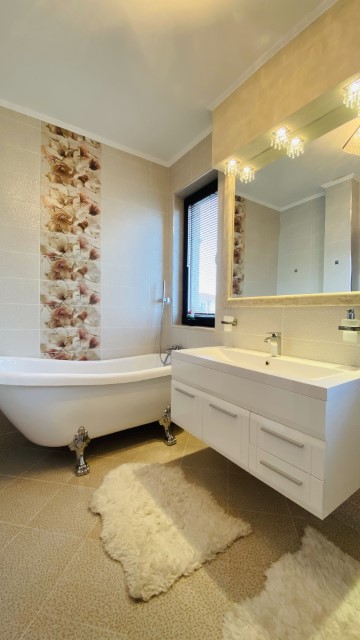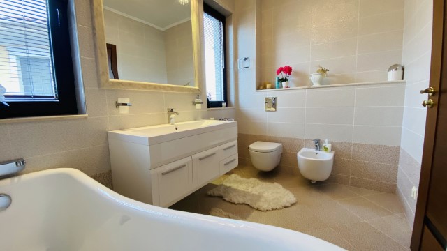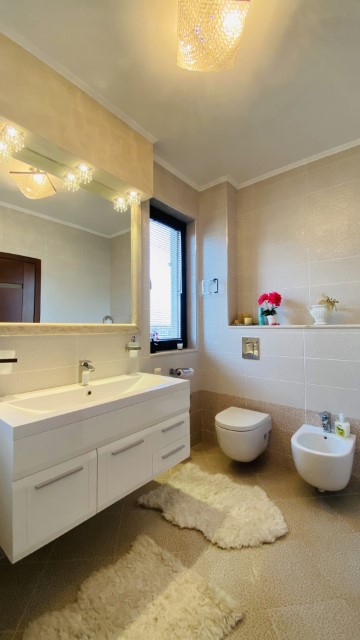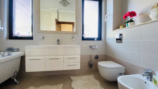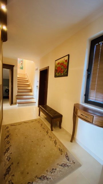 Finishing works: The house is fully finished - terracotta tiled and laminated floors; latex painted walls and ceilings; placed PVC joinery; placed armored entrance and MDF interior doors; shower/bathrooms with toilets - terracotta tiled floor, faience on the walls, sanitary ware, shower cabins, bathtub, water heaters; the heating is solved by means of placed fireplace in the living room, installed Air conditioning in all rooms.