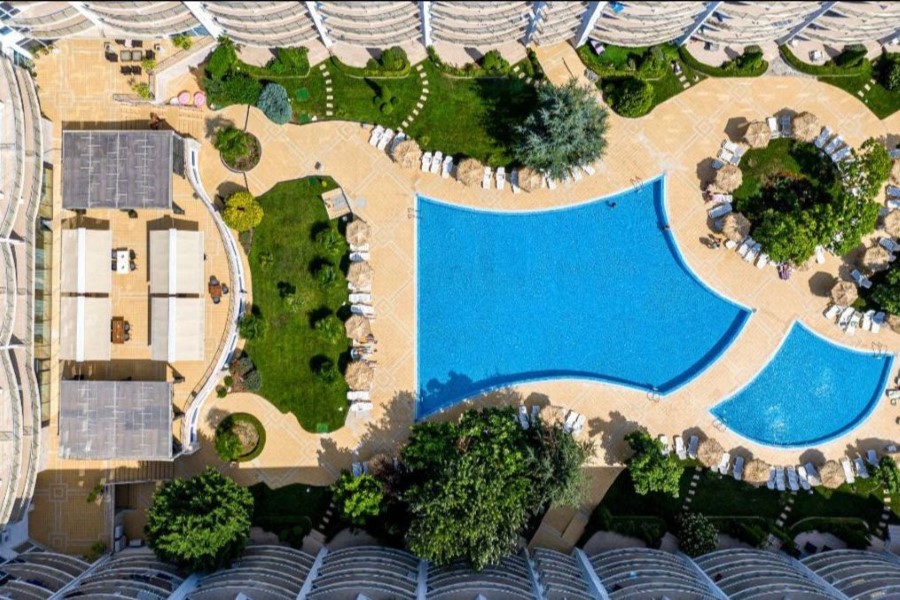 Description: One of the most beautiful complexes Atlantis Beach Resort is the largest project on the territory of Sarafovo South, which includes not only a well-developed residential area, but also rich infrastructure. The five buildings of the complex are shaped like a ship that seems to have moored in the Bay of Burgas. Buildings A, B and C are located at the top and are interconnected, but each has a separate entrance. Buildings E and F are located at the bottom of the complex. In the interior space formed by the buildings, amidst a sea of greenery and beautifully maintained common areas, there is a cascade of 4 swimming pools of varying sizes and depths. The gated complex is open all year round and features the most complete infrastructure - there is also an indoor swimming pool, a 24-hour reception, two restaurants, a pool bar, a night bar, year round SPA center, a Bowling Center, billiards, squash, a sports hall, a childrens playground, conference center, doctor's office, management company, year round 24 hour security, video surveillance and etc.
