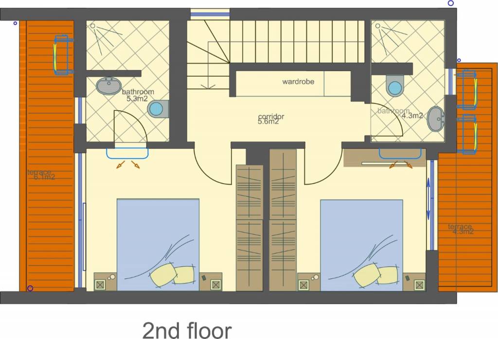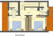 Second floor (64,69 sq.m) - corridor, two bedrooms, one of which has ensuite shower room with toilet and own terrace overlooking the pool, and the second one with its own terrace, second shower room with toilet;