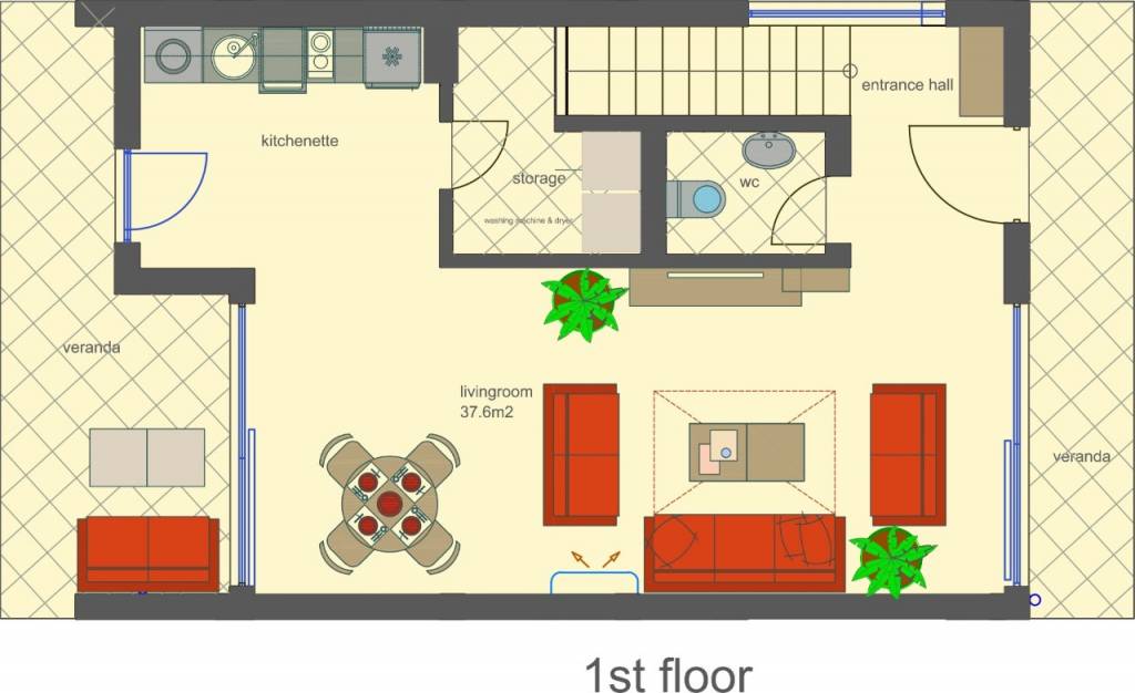 First floor (56,65 sq.m) - rear veranda on the east side, an entrance hall, large living room with kitchen and dining area, which opens onto a spacious front veranda and a private garden overlooking the pool, storage/utility room, guest toilet;