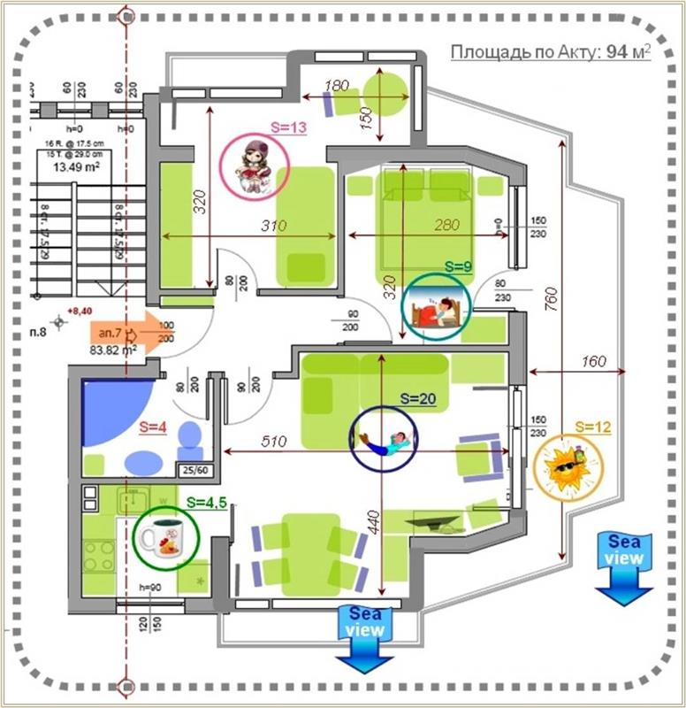Distribution: The flat includes a large and spacious living room with kitchenette and dinning area, two bedrooms, bathroom with toilet, one big and two smaller terraces and corridor.