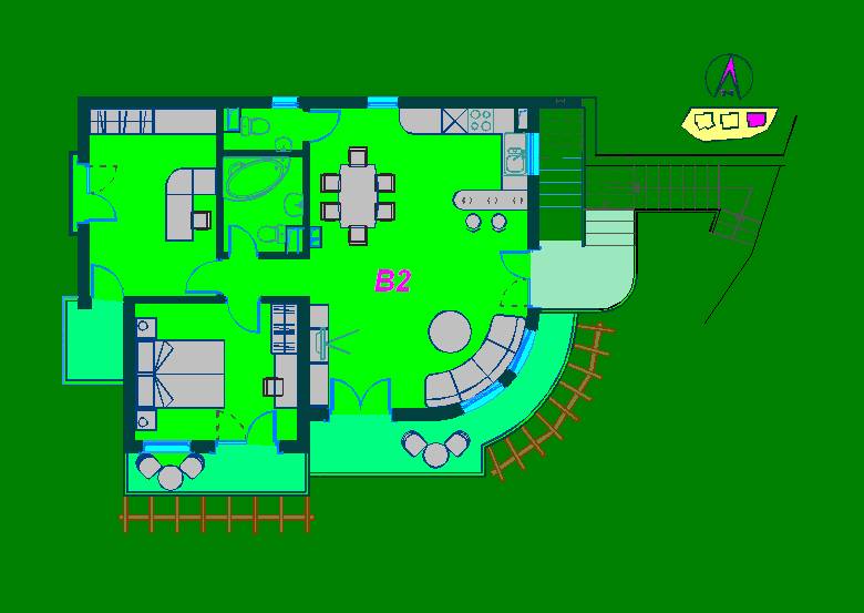 Description: The complex features three separate buildings - section A, B and C, swimming pool for adult and children with a geyser and illumination, Jakuzzi with waterfall, green areas with paths for walking, parking lots. The entire design of the complex is in Mediterranean style - with wood, stones, arbor, barbecues etc. The complex has its own treatment plant.
