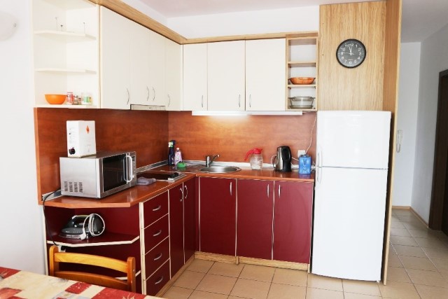 Finishing works: The apartment is fully finished - terracotta tiled and laminated floors; latex painted walls and ceilings; placed PVC joinery; placed entrance and MDF interior doors; sanitary units - fully finished and equipped, terracotta tiled floor, faience on the walls, sanitary ware, water heaters; installed Air conditioning in both rooms.