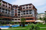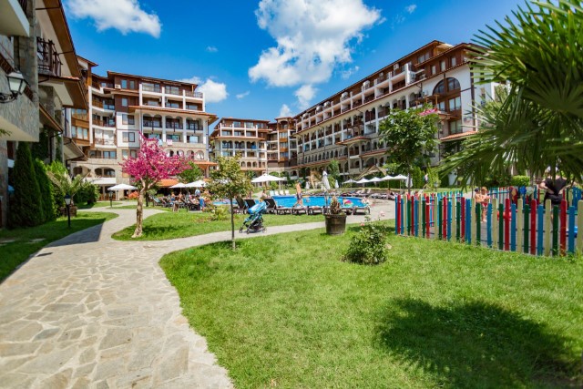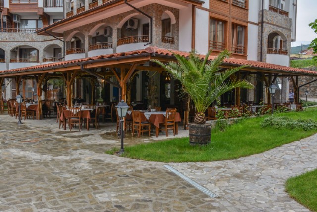 The property is located about 40 km away from Burgas city, about 9 km away from the municipal center - the town of Nesebar, about 400 meters away from the center of the town of Sveti Vlas and about 450 meters away from the beach. In the immediate vicinity of the complex there are: shops, restaurants, cafes, beauty centers and SPA center, Amphitheater Saint Vlas, Marina Dinevi, as well as many other amenities and attractions that Dinevi Resort offers. The area has a well-developed infrastructure, communications and a favorable combination of sea and mountain air. Olympus complex is designed in the style of "Old Bulgarian House" - its image is created by spacious terraces, narrow windows, large cornices, wooden gates, railings and stairs. The complex consists of two buildings, united by a richly landscaped yard with alleys.
