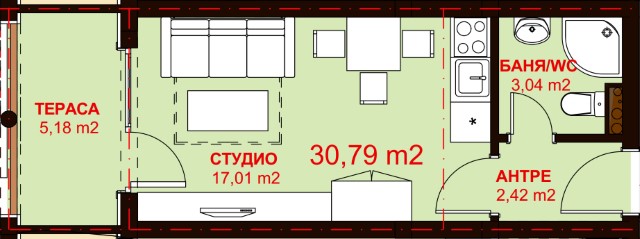Finishing works: The studio is fully finished - terracotta tiled floors; latex painted walls and ceilings; placed PVC joinery; placed entrance and MDF interior doors; sanitary unit - terracotta tiled floor, faience on the walls, sanitary ware, water heater.