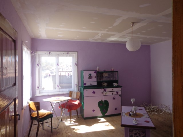 Finishing works: The house is partially finished - renovated roof; linoleum and wooden floors; latex painted walls; plasterboard ceilings; placed wooden joinery; placed metal entrance and wooden interior doors; sanitary unit - terracotta tiled floor, latex painted walls, sanitary ware, water heaters; the heating is solved by means of a stoves.