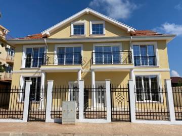 Description: We offer for sale a two, three-storey semi-detached houses - townhouses with a private yards, located in a quiet and peaceful street, about 300 meters away from the center and from the bus stop of the village of Ravda, about 700 meters away from the sea, about 900 meters away from Lidl supermarket, close to shops and all the necessary infrastructure. Each of the houses has a total built-up area of 211 sq.m. The Villa Masena building is designed in rococo style for two families to live in independently. With its countryside style, it claims to be one of the most beautiful and cozy places to live in the village of Ravda. The three-meter high ceilings and French windows will add to the light and space of the rooms. It is situated in the plot of land entirely to the south, which is the best exposure for year-round living in Bulgaria. The houses are situated in a common large plot of land, surrounded by a common concrete fence with wrought iron elements, hedges. To each of the houses belongs a landscaped plot of land with an area of 212 sq.m, which can park 2 cars. The yard also has space for a swimming pool, barbecue area and extensive landscaping.