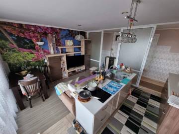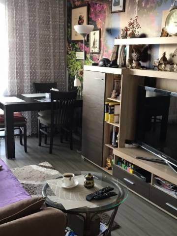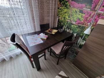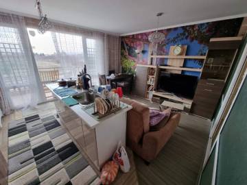 Finishing works: The apartment is fully finished - laminated and terracotta tiled floors; decorative panels, wallpaper and latex painted walls; latex painted ceilings; placed PVC joinery; placed entrance and MDF interior doors; sanitary units - fully finished and equipped, terracotta tiled floor, faience on the walls, sanitary ware, bathtub, water heater; installed pellet boiler in the corridor.