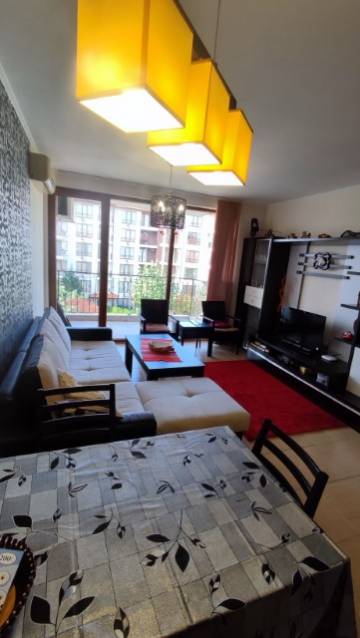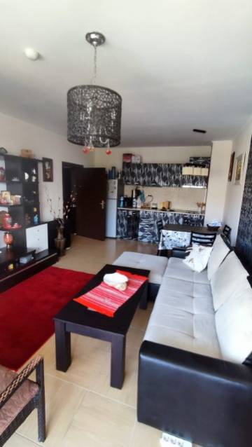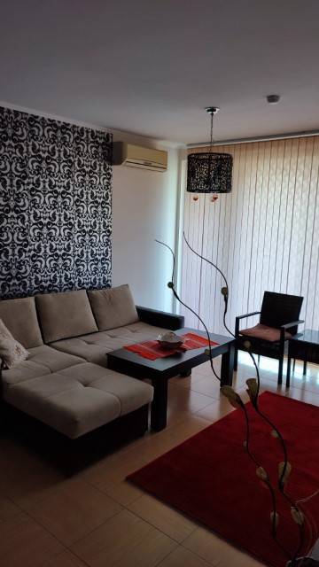 Finishing works: The apartment is fully finished - terracotta tiled and laminated floors; wallpaper and latex painted walls; latex painted ceilings; placed PVC joinery; placed entrance and MDF interior doors; shower room with toilet - fully finished and equipped, terracotta tiled floor, faience on the walls, sanitary ware, shower cabin, water heater; installed Air conditioning in the living room.