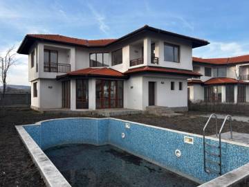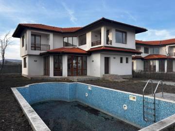 For sale a partially furnished, two-storey house with a pool and parking lots in a gated complex, about 3 km away from the beach in the town of Aheloy, Pomorie municipality