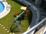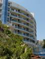 The building benefits from planted garden surroundings, a parking lot to the West and cascade of swimming pools to the East.
