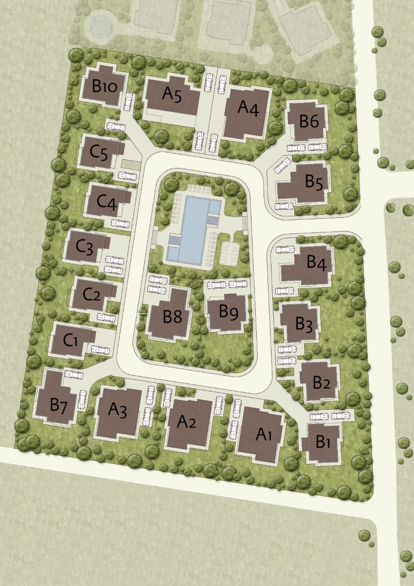 Type C - The comfortable and practical type C houses are with a total built-up area from 142,35 sq.m and a yard with an area of 242 - 259 sq.m. Houses are perfect for spending quality time with your family. The houses are either detached and have a cosy living room with an open plan kitchen, panoramic windows offering a view to the swimming pool – this will inevitably become a favourite spot for your whole family. On the second floor you will find 3 bedrooms, each with terraces and bathroom.
