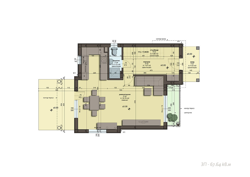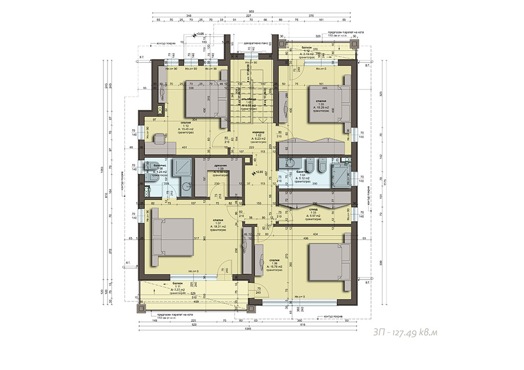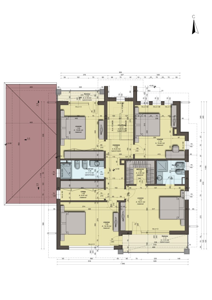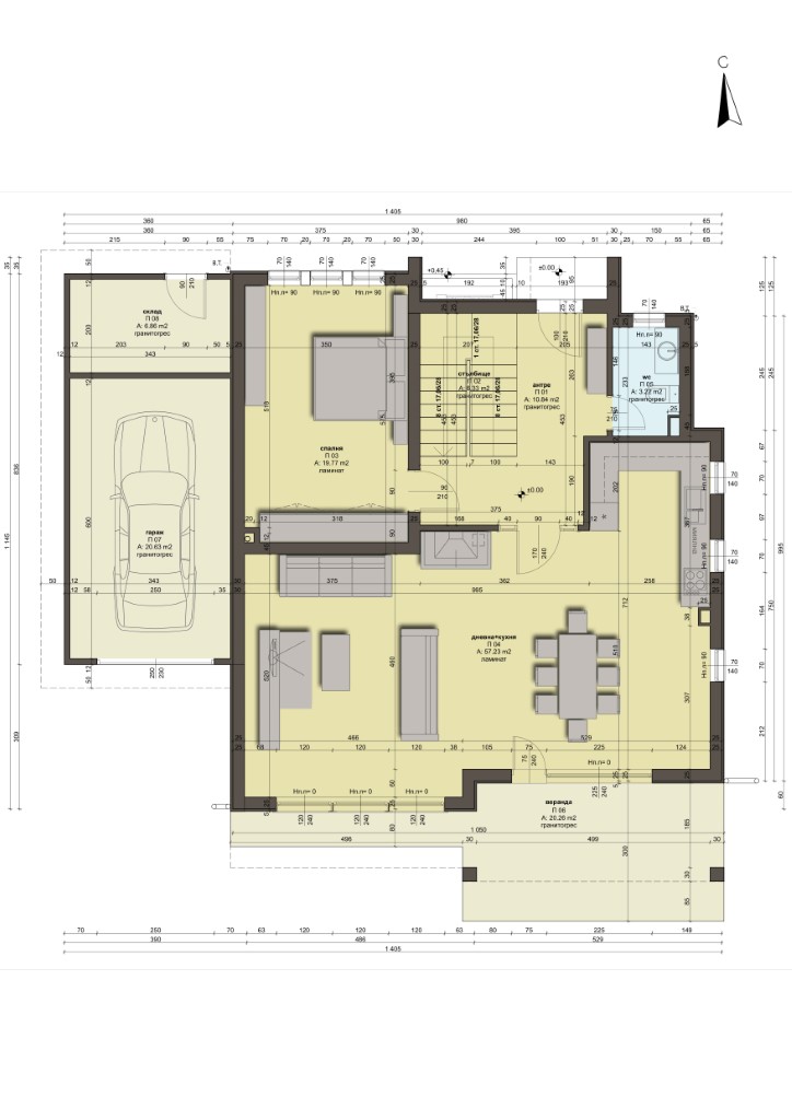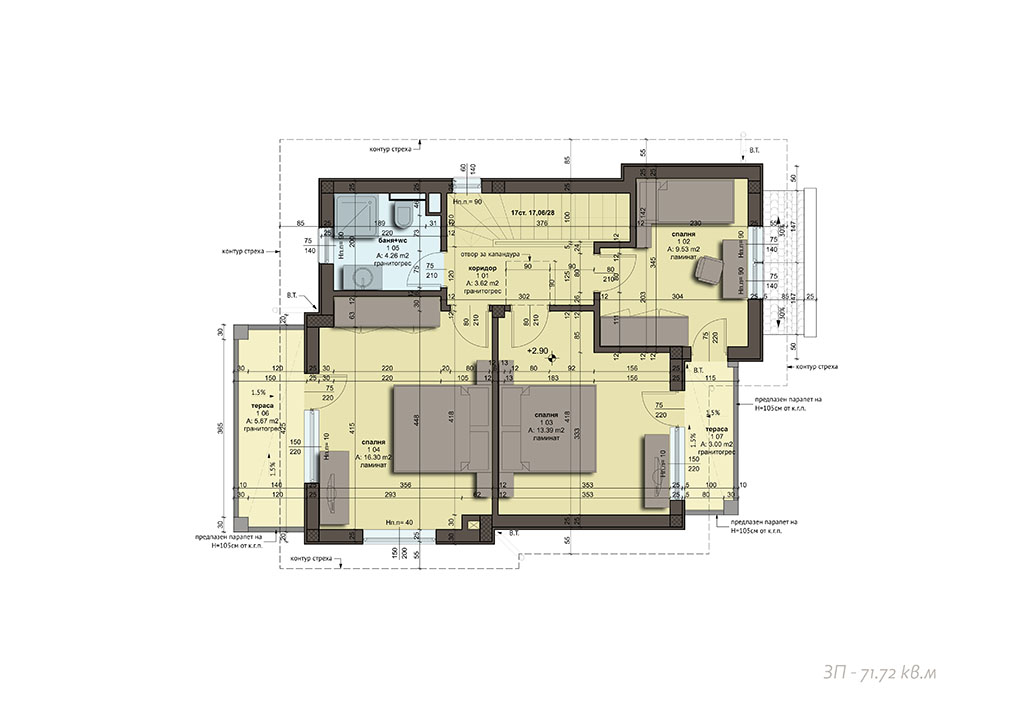 Type A - The magnificent and spacious type A houses are with a total built-up area of 235 - 275,18 sq.m and a yard with an area of 361 - 401,58 sq.m and are specially designed to satisfy the requirements of our most demanding customers. The airy living rooms will welcome you and your guests with open arms and gorgeous veranda and gazevo will make your summer evenings unforgettable. Your French windows will offer you an amazing view of the whole complex and the splendour of the blue sea beyond. On the second floor, you have a choice between a second guest room (mursery) ot large terraces and a water mirror.