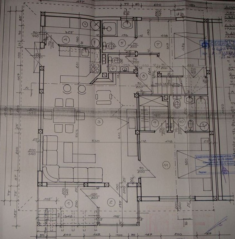 Finishing works: The house has monolithic reinforced concrete construction, brickwork, heat- (styrofoam with a thickness of 8 cm) and hydro-insulation and new tiled roof. The house is fully finished - flooring - fine stoneware tiles in the living rooms, entrance halls and on the terraces and laminated parquet in the bedrooms; decoration and latex painted walls; suspended and latex painted ceilings; placed entrance and MDF interior doors; placed 5-chamber PVC joinery with double glazing TROCAL brand, dark-brown color, KA-glass; sanitary units - fully finished and equipped, terracotta tiled floors, faience on the walls, sanitary equipment; designer wrought iron railings on the staircase and terraces.