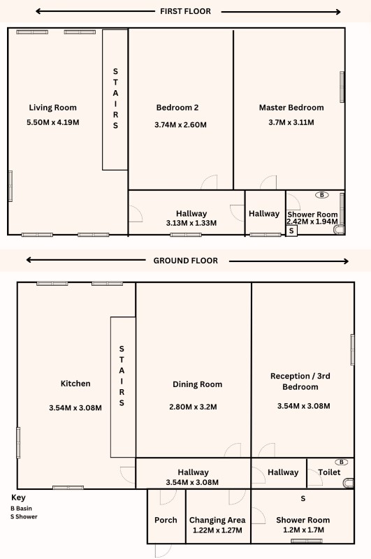 Second floor - large living room, corridor, two bedrooms and shower room with toilet;