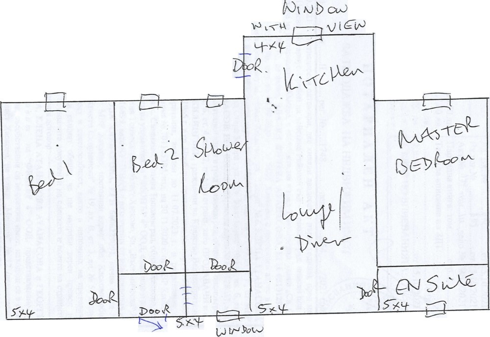 Distribution: corridor, living room with kitchen and dining area, master bedroom with ensuite shower room with toilet, two bedrooms, second shower room with toilet.