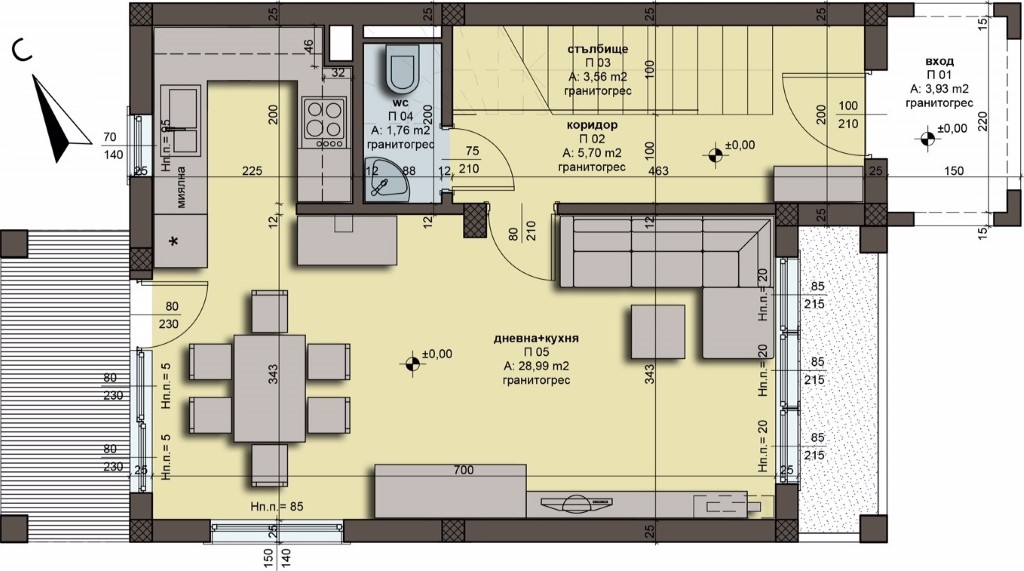 First floor (51,63 sq.m) - corridor, spacious living room with kitchen and dining area with an access to veranda and terrace, toilet and utility room under the staircase;