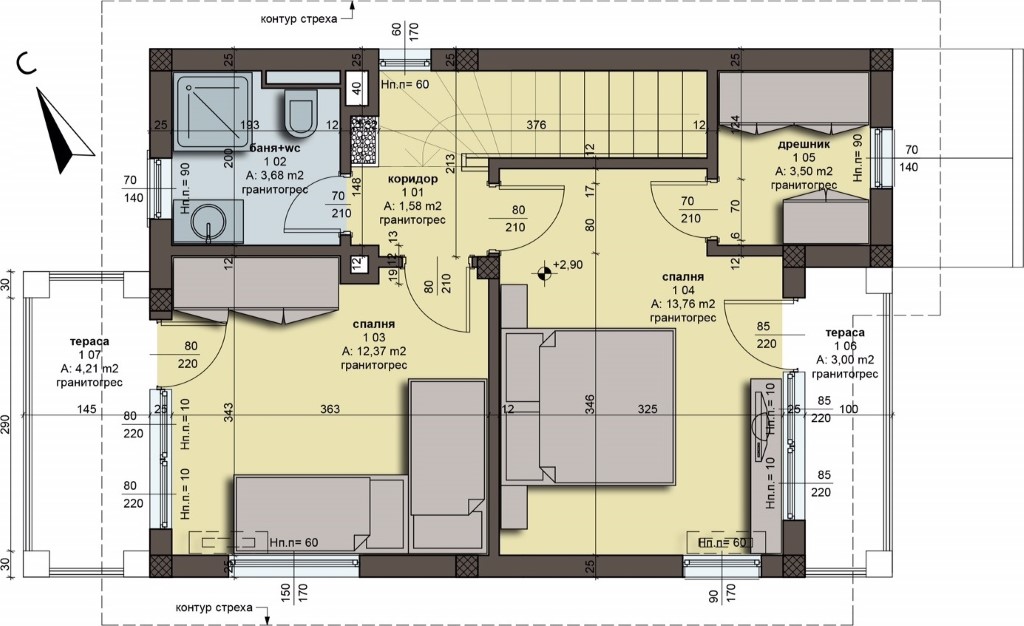 Second floor (56,50 sq.m) - corridor, two bedrooms, each of which have an own terrace, and one of bedrooms has own closet, shower room with toilet;