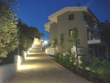 The largest part of the land plot is shared with the other houses of the complex. It is covered by lawn and decorated with other plants. Olive trees and other fruit trees have been planted on a part of the land of about 2,000 sq.m. The beach is about 70 meters away from the house, it is sandy and wide and its waters are clean. It is possible for a car to get to the beach by a street within the land plot.