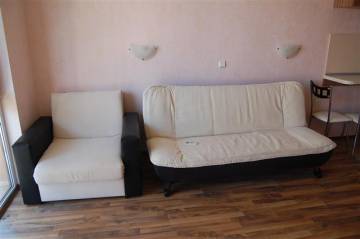 Furniture and Equipment: wardrobe, TV, Air conditioning, sofa, armchair, built in kitchen with equipment - refrigerator, hot plate, adsorber, sink with mixing tap, breakfast bar, two bar chairs.