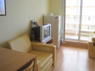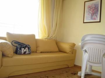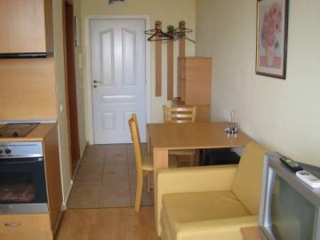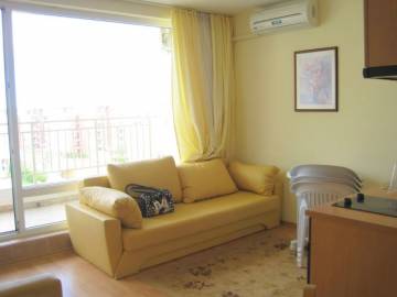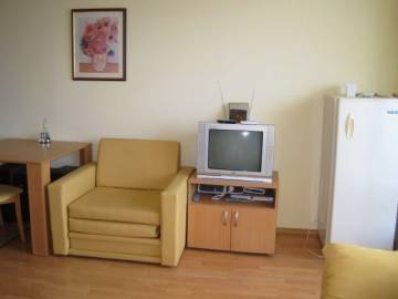 Furnishing: The studio is offered for sale fully furnished !!! - kitchen furniture, sink with mixer tap, refrigerator, washing machine, hobs and oven, extractor, cutlery and crockery, electric kettle, toaster, Air-conditioner, sofa bed, sofa armchair, coffee table, TV cabinet, TV, TV reciever, DVD player, electric heater with fan, dining table, 2 chairs, cabinet, chest of drawers, hanger, pictures, carpet, curtains, bed linen, accessories for decoration, PVC table and 4 chairs.