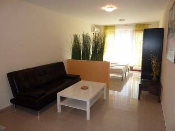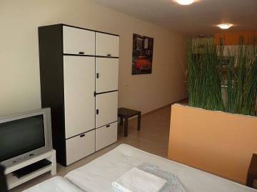 Description: We offer for sale luxury studio in MM complex, 300 meters from the town centre, 500 meters from the beach and 300 meters from the Aquapark. The studio is situated on fourth floor in five-storey building, with a total area of 46 sq.m. It consists of entrance hall, living room with kitchenette and sleeping area, bathroom with toilet and terrace with pool view. The apartment is for sale fully finished, furnished and equipped. In the studio there is an air conditioner, part wall separating it for two rooms, double bed which could be separate to two singles and sofa bed. The studio is ideal for family with two children. The complex features an outdoor area with a pool and a hot tub, as well as with a cafe bar, free deckchairs and umbrellas. Wi-Fi internet is also available for free. Private parking is possible on site for free.