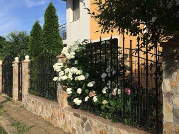 Yard: The plot of land has an area of 885 sq.m, surrounded by a solid fence of wrought iron, flat. There is an garage with automatic door opening, a parking lot for one car and two sinks in the yard. Various fruit and decorative trees and shrubs (4 peaches, 2 apricots, 2 sour cherries, 1 blue plum, 3 apples, 3 pears, 2 cherries, blueberries, raspberries, vines), as well as many roses and other flowers, grow in the yard.