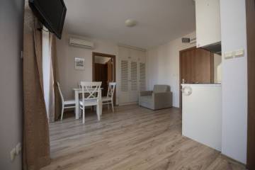 Finishing works: The apartment is fully finished - laminated floors; latex painted walls and ceilings; placed PVC joinery; placed entrance and MDF interior doors; sanitary units - fully finished and equipped, terracotta tiled floor, faience on the walls, sanitary ware, shower cabins, water heaters; installed Air conditioning in the living.