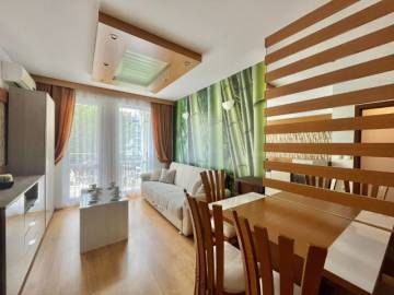 For sale a cozy, fully furnished, one-bedroom apartment with a pool view in a luxury gated complex, about 800 meters away from the beach in Sunny Beach Resort, Nesebar municipality