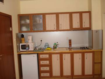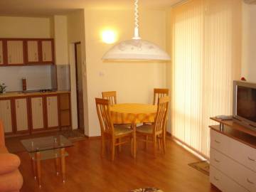 It offers 40 sq.m of living area distributed between an open plan living room with a kitchen box, bathroom and a toilet and a balcony. The apartment is fully furnished and fitted with cooking facilities (refrigerator, microwave oven, a hob, etc.), TV and Radio (cable television with international channels), air-conditioner, etc. There is a modern, fully fitted bathroom and a toilet. The apartment is in perfect condition and ready for your holidays. There are regular bus lines to and from Bourgas.